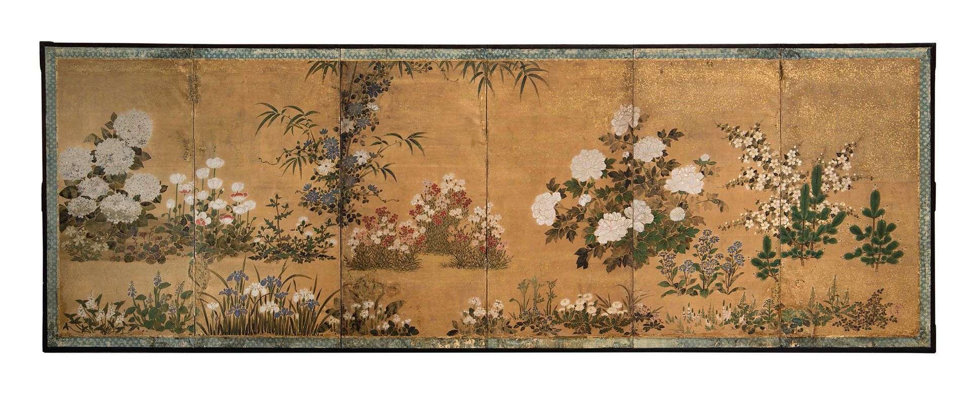 Paravent à six feuilles de style Rinpa, décoré à l'encre et couleurs sur papier à fond chamois moucheté or, représentant un jardin imaginaire regroupant des fleurs des quatre saisons : hortensias, pavots, pissenlits, clématite, bambous, oeillets, pivoines, jeunes pousses de pins, iris, sagittaires trifoliées... La composition élégante où chaque espèce est figurée en un dense bouquet où s'entremêlent harmonieusement fleurs et feuilles. En partie inférieure droite, le sceau circulaire rouge «I'nen».