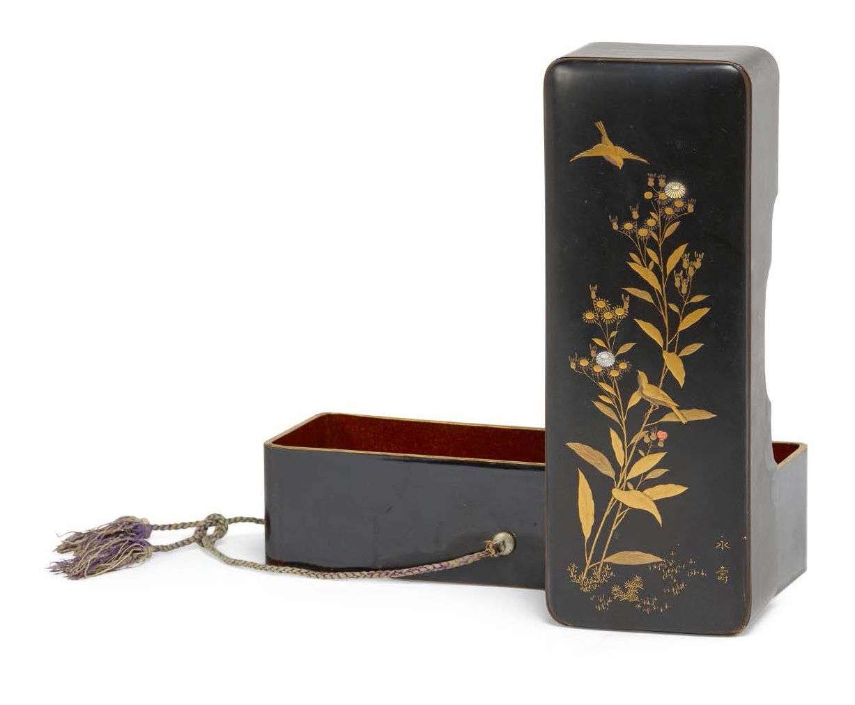 Boîte à lettres (fubako) en laque maki-e, takamaki-e et incrustations de nacre et corail représentant deux petits oiseaux, l'un perché sur une haute tige fleurie, l'autre voletant en partie supérieure gauche. L'intérieur en laque nashiji. Avec une signature «Eisu» en partie inférieure droite.