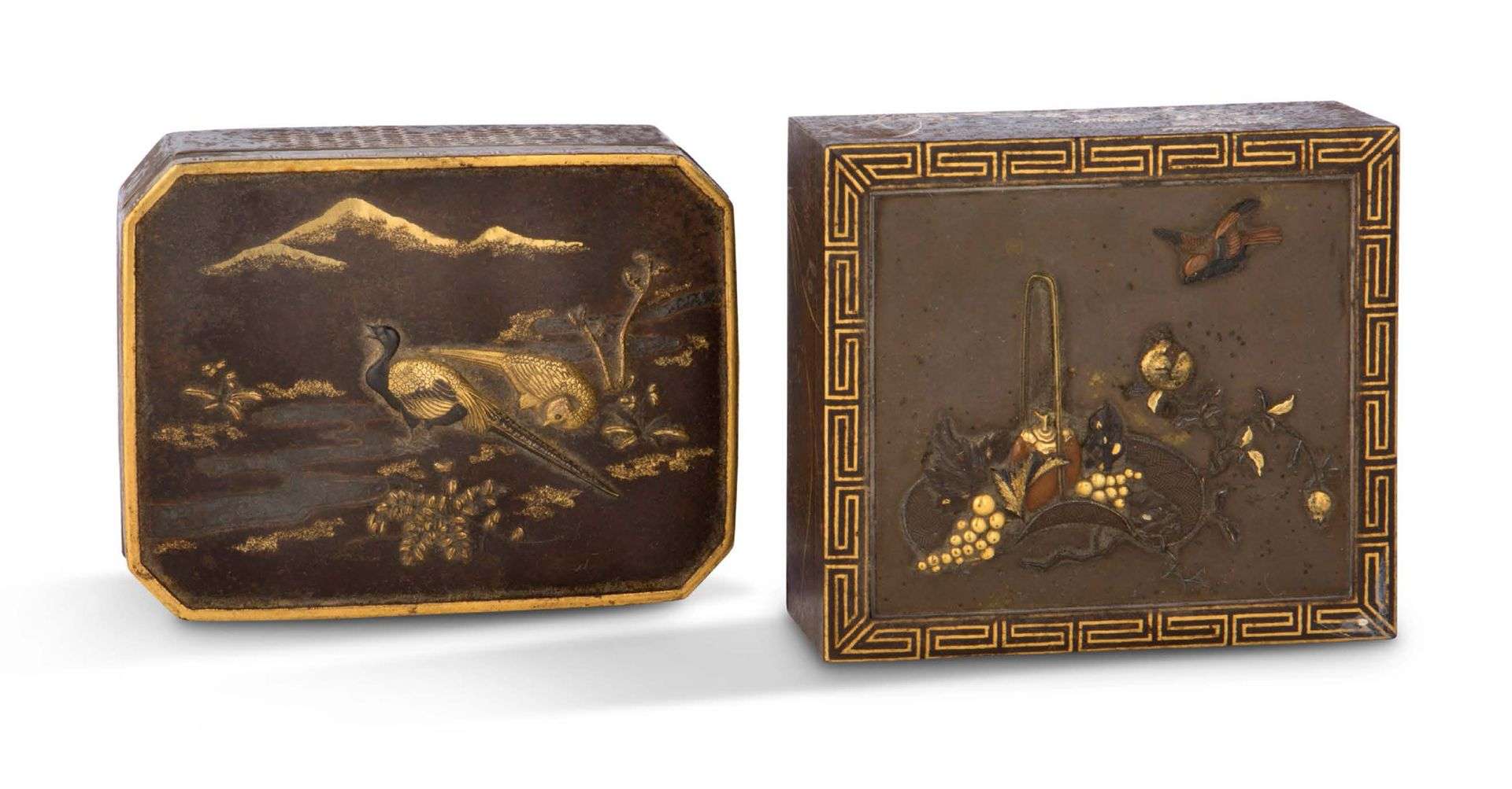 Ensemble de deux boîtes en bronze à décor incrusté d'or, d'argent et de cuivre.