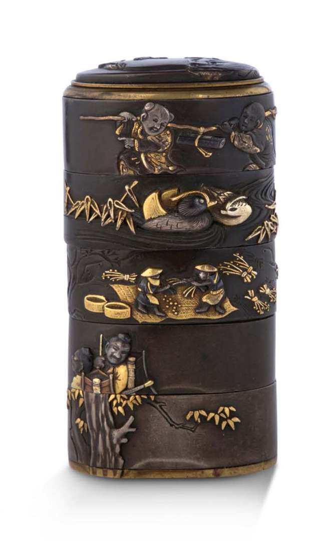 Intéressante boîte à quatre cases composée de cinq fuchi et un kashira formant couvercle en bronze patiné incrusté.