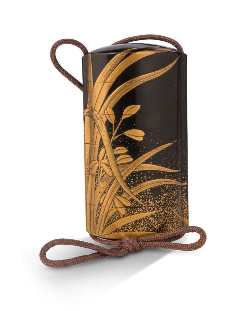 Inro à 5 cases en laque d'or maki-e et takamaki-e sur fond noir à décor d'orchidées sauvages. L'intérieur en laque nashiji.
