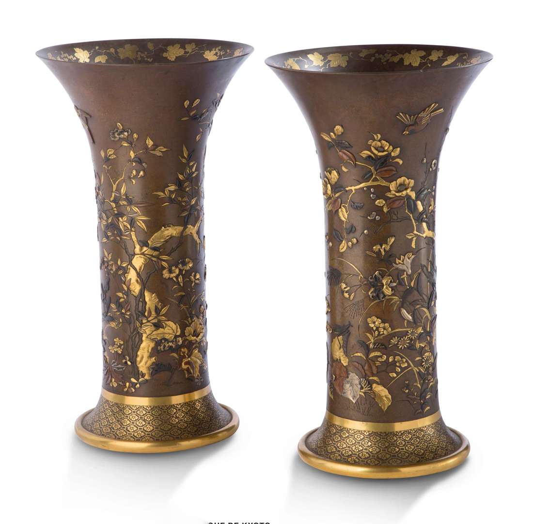 Importante paire de vases cornet en bronze sentoku à patine brun caramel, la base légèrement évasée incrustée, en nunomezogan d'or, d'une résille de fleurs stylisées, et encadrée par deux bandeaux or. La panse librement ornée, en kebori, katakiri et takazogan d'or, argent, cuivre et shakudo, d'un décor où foisonnent et se mêlent lys, orchidées sauvages, susuki à l'ombre d'un imposant prunus et de pivoines arbustives entremêlant leurs branches.