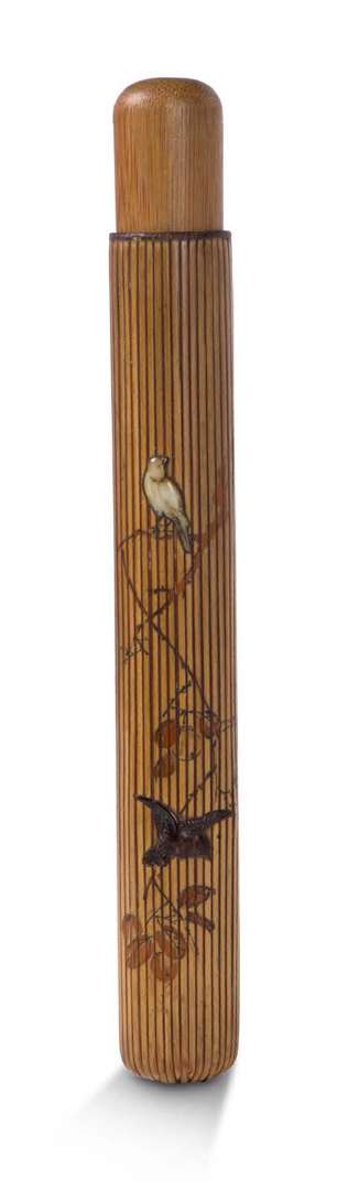 Étui à pipe (kiseru-zutsu) de type muso-zutsu, la partie supérieure en bambou, la partie inférieure avec des lanières de rotin appliquées imitant des cannelures, incrustée de deux oiseaux en pierre dure parmi des branches de plaqueminier délicatement gravées.