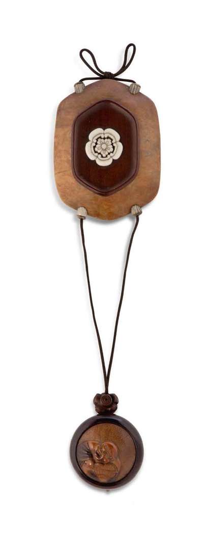 Blague à tabac (tonkotsu) en gourde évidée, le couvercle en bois incrusté d'une fleur de cerisier stylisée, avec son monju en bois et bambou sculpté d'une représentation de Hotei tenant un éventail.