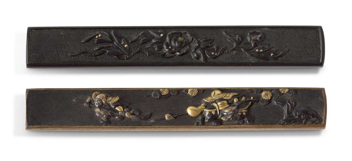 Ensemble de deux kozuka en shakudo, l'un à décor ciselé de pivoines sur fond de nanako, l'autre orné de deux guerriers s'affrontant sous un pin sur fond de nanako.
