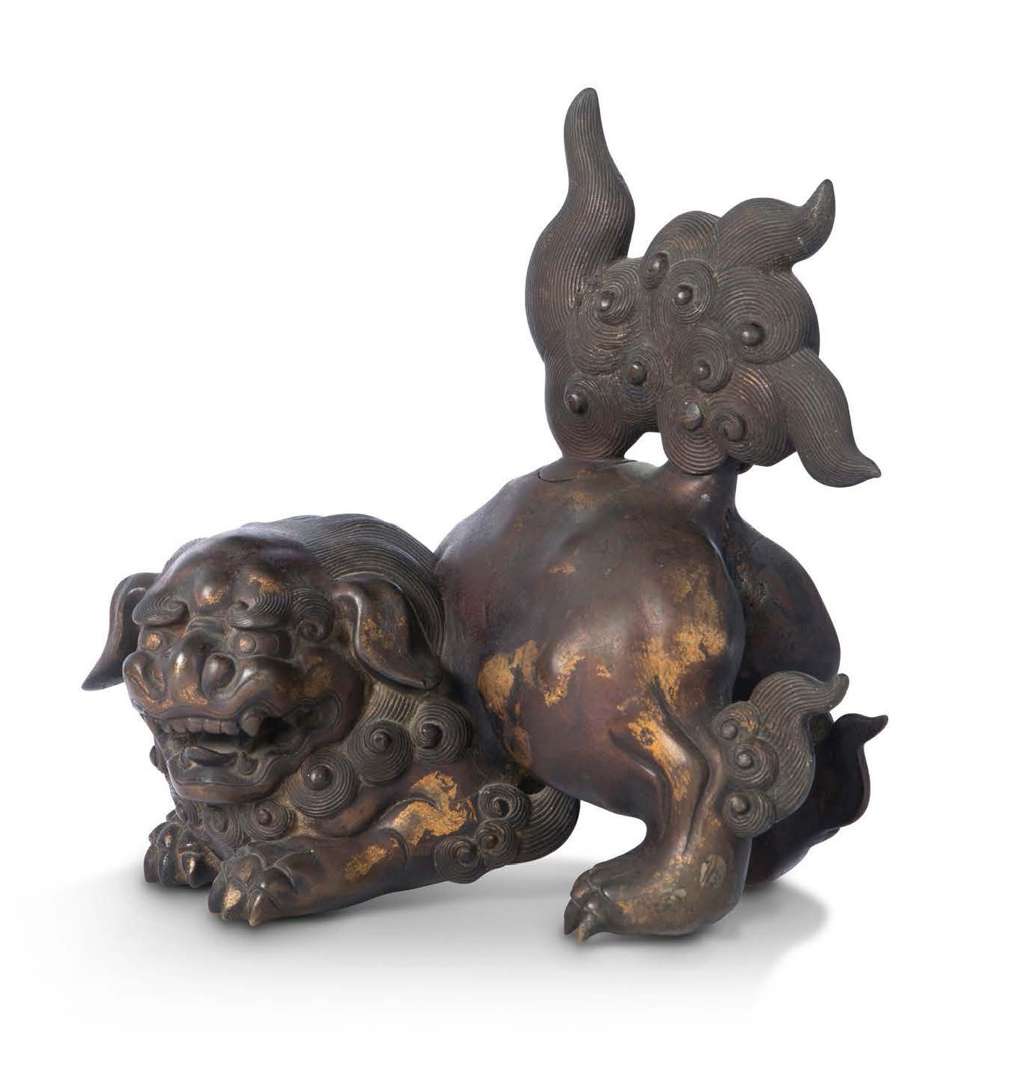 Lion boudhique (shishi) en bronze avec des traces de dorure, formant brûle-parfum.