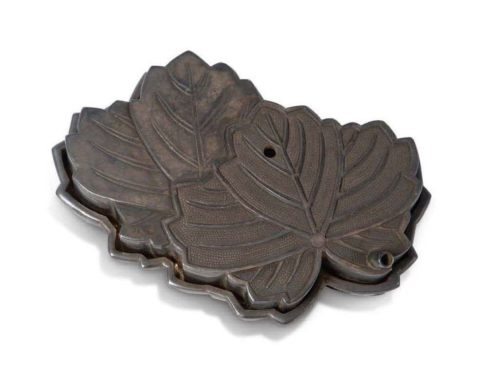 Petit compte-goutte (suiteki) en argent imitant deux feuilles de paulownia superposées.
