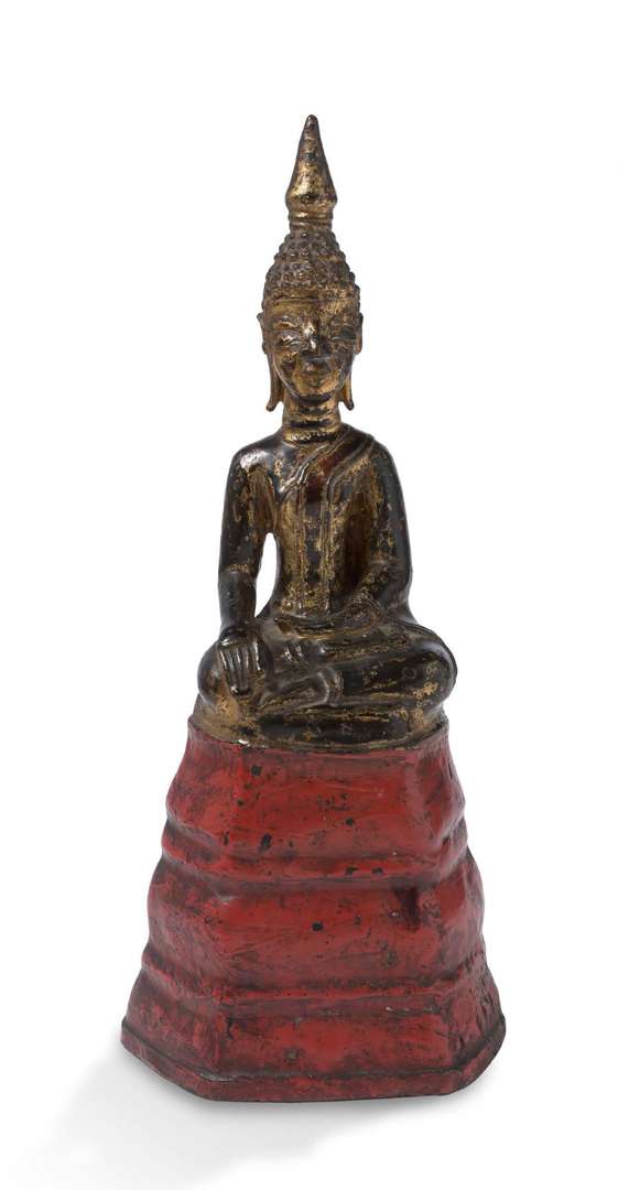 Statuette en bronze laqué doré représentant le Bouddha assis sur un haut piédestal à gradins laqué rouge, les mains en bhumisparsa mudra.