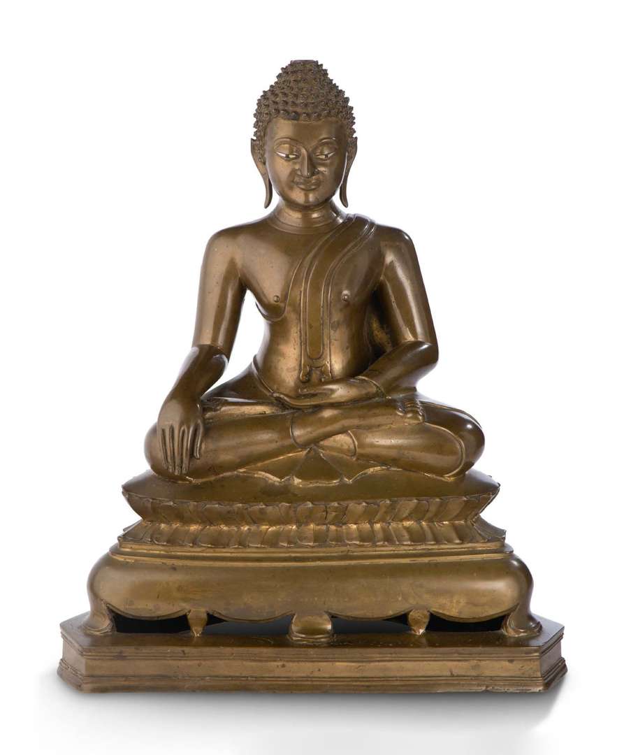 Importante statue en bronze à patine brune représentant le Bouddha Shakyamuni assis en padmasana sur une double base lotiforme reposant sur un important piédestal, les mains en bhumiparsha mudra, vêtu d'une fine robe monastique découvrant l'épaule gauche, avec l'un des pans retombant élégamment sur son torse. Le visage aux sourcils arqués et au nez aquilin, les yeux étirés incrustés de nacre.