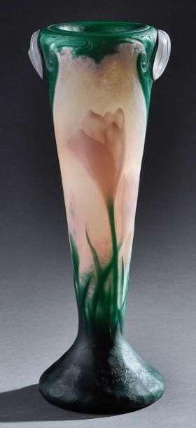 Exceptionnel vase de forme conique sur talon plat circulaire en verre triple couches à décor dégagé à l'acide de tulipes rose à feuilles vertes reprises à la meule sur un fond finement martelé givré opaque. Le col ourlé est martelé et présente en bordure un décor de volutes reprises à la meule et deux cabochons roses en application également repris à la roue. Signature incisée «Daum Nancy». Vers 1900. H: 21 cm Diam: 8 cm An exceptional conical shaped, cameo glass vase with acid-etched tulips gone over with the wheel on a lightly hammered, frosted background. Incised signature «Daum Nancy». Circa 1900. H: 8 ¼ in Diam: 3 in Bien que d'inspiration identique aux vases de série reproduits ci-dessous, notre vase, piece unique, avec ses rajouts d'applications de part et d'autre du col, a probablement été montré lors d'une des grandes expositions auxquelles Daum participait à la fin du XIXème siècle et au début du XXème siècle. Our vase, unique piece, with applications on each side of the neck, is of the same inspiration as shown below and was most probably exhibited by Daum during one of the great exhibitions at the end of the 19th and beginning of the 20th centuries.