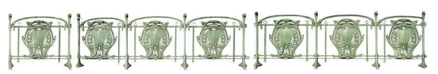 Exceptionnel ensemble de sept plaques d'ornement de métro en fonte à patine verte, à décor d'éléments végétaux stylisés animés de crosses en découpe et d'un «M» stylisé à la base. H: 100 cm Longueur totale: 700 cm (Visserie non d'origine et légères modifications) a cast iron decorated with stylised plants and a stylised. H: 39 1/3 in Total length: 275 ½ in Bibliographie: "Guimard", Edition RMN, Paris, 1992, pour des modèles similaires reproduits page 240. Hector Guimard est le représentant majeur de l'art nouveau en France. Il se voit confier en 1900 l'édification des accès aux stations métropolitaines de Paris pour lesquelles il conçoit tout d'abord les gares de la Bastille et de l'Etoile, avec divers types de pavillons couverts puis les candélabres et supports d'enseigne. Vers 1904, Guimard est écarté du projet pour des raisons financières et perd ses droits de propriété et de reproduction. Une cavale médiatique déferle sur lui considérant son art comme «excentrique « dénaturant les sites prestigieux. Malgré cela, la compagnie en charge du projet continue à utiliser les entourages simples réalisés par Guimard jusqu'en 1913. Le génie de Guimard se révèle dans le fait d'avoir élaboré une série modulaire et standardisée permettant à la fois, sur le point technique, de répondre aux nécessités propres à chaque accès et d'offrir sur le point esthétique, une possibilité de variations sur chaque type de structure. Seule une parfaite connaissance des matériaux permettait la fusion de la technique et du design. Ainsi, il démontre avec virtuosité la potentialité de la fonte de fer. Par les silhouettes originales des accès du métropolitain reflétant une ardeur juvénile, Guimard exprime également son goût de la couleur à la fois raffinée et violente. Une note «moderne» bien que controversée était indispensable à une innovation aussi moderne que le métro lui même! Hector Guimard is the major figure of Art Nouveau in France. In 1900 he was asked to create the entrance to the met