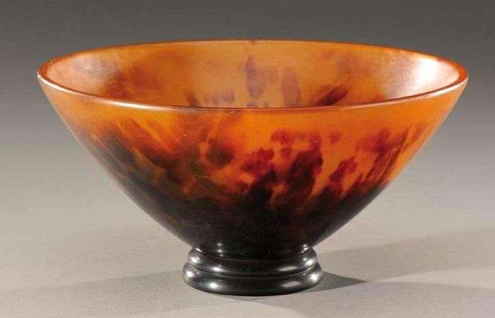 Rare coupe circulaire évasée sur talon plat circulaire en écaille de tortue sculptée. Signée «G.Bastard». Vers 1920. H: 8 cm Diam: 16 cm A rare circular bowl on foot in carved tortoise shell. Signed «G.Bastard». Circa 1920. H: 3 in Diam: 6 1/3 in Les créations Art Nouveau de Georges Bastard sont remarquables mais il reste une des figures majeures de l'Art Déco et de l'Union des Artistes Modernes. Sa production, riche de boîtes, éventails, coupe-papier, bonbonnières, coupes et bijoux, se caractérise par l'emploi de matières délicates comme la nacre, l'ivoire ou comme pour notre coupe l'écaille. Cet amour pour le travail fin et les matières délicates lui vient probablement de son grand-père qui était un grand spécialiste du travail du bois précieux, de l'ivoire et autres matériaux utilisés pour fabriquer des objets tels que les damiers ou les échiquiers. Les oeuvres de Georges Bastard pour la plupart uniques étaient souvent remarquées et saluées lors des Salons de la Société des Artistes français. Although Georges Bastard Art Nouveau creations are outstanding he remains one of the major figures of Art Deco and of the Union des Artistes Moderns. His rich production of boxes, fans, paper knives, sweet boxes, bowls and jewellery is characterized by his use of such delicate materials as mother-of-pearl, ivory, or tortoiseshell as for our bowl. He most probably inherited this love of fine work and delicate materials from his grandfather who was a great specialist in working with precious wood, ivory and other materials used for making such objects as draughtboards or chessboards. Most of Georges Bastard pieces were unique and often attracted attention and were greeted with pleasure during the Salons de la Société des Artists Français.