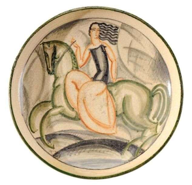 Exceptionnel plat circulaire en grès craquelé émaillé à décor d'une femme sur un cheval dans les tons verts, noirs, gris et brun sur fond beige. Signature manuscrite à l'émail vert «René Buthaud». Vers 1920-1923. Diam: 35 cm An exceptional circular dish in crackled enamel stoneware representing a woman on a horse. Hand written signature «René Buthaud». Circa 1920-1923. Diam: 13 ¾ in Bibliographie: Pierre Cruège, «René Buthaud 1886- 1986», les éditions de l'Amateur, Paris, 1996, modèle reproduit page 72. C'est à partir de 1919 que René Buthaud, élève de l'Ecole des Beaux-Arts de Bordeaux, se consacra à la céramique. De nombreuses créations de la première et deuxième période de René Buthaud témoignent de son goût pour le classicisme bordelais incarné par des artistes académiques tels que Jean Dupas, Raphaël Delorme ou encore Jean Despujols et de ses affinités avec l'Art nègre et les Ballets Russes qu'il a admiré dans les décors de Bourdelle et Maurice Denis au théâtre des Champs-Elysées. Dans ce rare plat que nous vous présentons, probablement une pièce unique on assiste à une synthèse moderne de l'univers pictural qui s'offrait à lui dans ces années là. On retrouve dans celui-ci la stylisation des formes et des contours très classicisants aux échos cubistes reflétés par l'étirement longiligne des femmes et une grande liberté de graphisme qui rappellent de nombreuses oeuvres d'artistes de l'école bordelaise. Ainsi, de grands artistes tels que Vlaminck ou Derain seront parmi les premiers à acheter des céramiques de Buthaud avant d'eux-mêmes s'y intéresser et les adopter dans leur oeuvre. It is from 1919 that René Buthaud, the student from the Ecole des Beaux Arts de Bordeaux, devoted himself to ceramic work. Many of these creations from René Buthaud's first and second periods show his taste for the classical Bordeaux style as personified by such academic artists as Jean Dupas, Raphaêl Delorme or yet again Jean Desjujols and his love of L'art Negre and the Ballet Russes