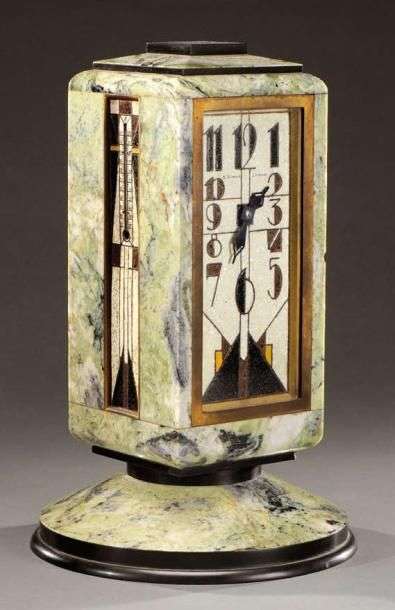 Rare pendule quadrangulaire tournante en onyx vert veiné blanc et noir présentant quatre cadrans émaillés à motifs géométriques noirs, marron et jaunes et reposant sur une base circulaire. Signée «E.Gubelin» et située à Lucerne. Vers 1920-1930. H: 35 cm (Thermomètres manquants) A rare quadrangular turning clock in onyx with four enamelled dials and geometrical motifs standing on a circular base. Signed «E.Gubelin» and situated in Lucerne. Circa 1920-1930. H: 13 ¾ in