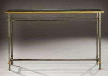 Exceptionnelle console en métal à patine canon de fusil présentant un plateau rectangulaire en miroir reposant sur quatre montants de section carrée soulignés de bagues en bronze doré et reliés par des traverses droites formant entretoise en partie basse. La réalisation est vraisemblablement due à Gilbert Poillerat. Vers 1950-1960. H: 91 cm L: 147 cm P: 28 cm (Légères rayures d'usage et traces d'oxydation) An exceptional gunmetal patina console with a top in mirror on four square cut uprights trimmed with gilded bronze rings. Most probably made by Gilbert Poillerat. Circa 1950-1960. H: 36 in L: 58 in D: 11 in Provenance: Famille de l'artiste.