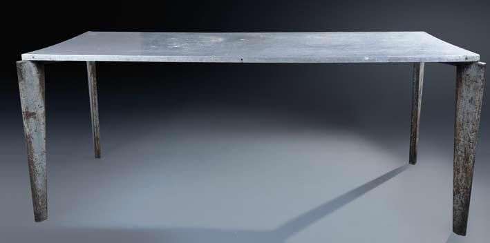 Fabrication Ateliers Jean Prouvé (1903-1999) Rare table de salle à manger modèle «Flavigny» modèle numéro 504 à plateau rectangulaire en chêne recouvert en parclose d'aluminium reposant sur un piétement d'angle profilé en tôle pliée à entretoise en double Y en tube d'acier soudé laqué vert. Vers 1941. H: 74 cm L: 183 cm D: 83,5 cm A rare dining room table, model «Flavigny» num. 504 with an oak top covered in aluminium on a streamlined base in folded sheet metal. Circa 1941. H: 29 in L: 72 in D: 33 in Bibliographie: -Peter Sulzer, «Jean Prouvé Oeuvre complète volume 3 1944 / 1954» Birkhaûser, Berlin 2005, modèle reproduit page 184, croquis «1163.11» - Peter Sulzer, «Jean Prouvé Oeuvre complète volume 2 1934 / 1944»Birkhaûser, Berlin 2005, modèle approchant page 284, croquis «886» Jean Prouvé était le fils de Victor Prouvé, le fondateur de l'Ecole de Nancy et le filleul de d'Emile Gallé. Il apprit le travail du métal au près des ferronnier sEmile Robert et Adalbert Szabo. Il consacra toute sa vie au travail du métal autant dans la construction d'éléments d'architecture que dans la conception de meubles. Cet exceptionnel ensemble de créations réalisées par les Ateliers Jean Prouvé entre 1941 et 1951, en collaboration avec Pierre Jeanneret et Charlotte Perriand, est un parfait exemple de l'utilisation de ses matériaux de prédilection dans la conception de meubles urbanistes tels que la tôle d'acier, l'aluminium et le bois qui sont ici tous représentés à travers le bahut, les deux tables, l'applique potence et le fauteuil. Jean Prouvé was both the son of Victor Prouvé who founded the Ecole de Nancy, and the godson of Emile Gallé. He studied metal work with the wrought iron craftsmen Emile Robert and Aldalbert Szabo and dedicated his life to the use of metal in architecture as well as in furniture. This exceptional set, made between 1944 and 1951 in the Ateliers Jean Prouvé, in collaboration with Pierre Jeanneret and Charlotte Perriand, shows perfectly his partiality for