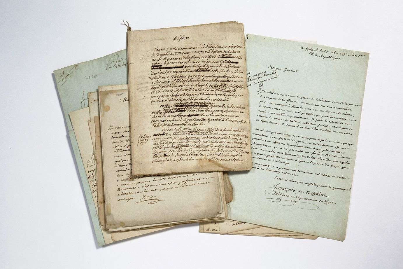 FRANÇOIS DE NEUFCHÂTEAU Nicolas-Louis. 5 L.A.S., 1792-1824 (9 p. formats divers, portrait joint), à Dumouriez, Raynouard, N. Lemercier, etc.