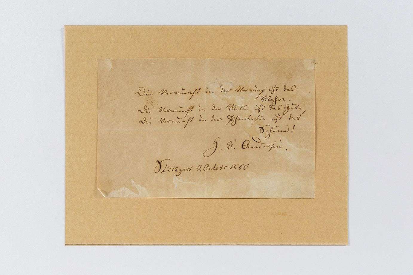 POÈME autographe signé « H. C. Andersen », Stuttgart 2 octobre 1860 | 1 page oblong in-8 (montée sur carte | un peu jaunie, avec traces de montage) | en allemand.