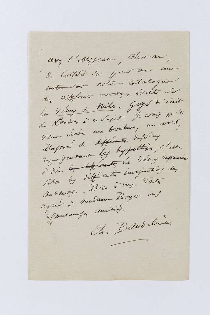 « Ayez l'obligeance, cher ami, de laisser ici pour moi une note-catalogue des différents ouvrages écrits sur la Vénus de Milo. GUYS m'écrit de Londres à ce sujet. Je crois qu'il veut écrire une brochure, un article, illustré de dessins représentant les hypothèses, c'est-à-dire la Vénus restaurée selon les différentes imaginations des auteurs »…
