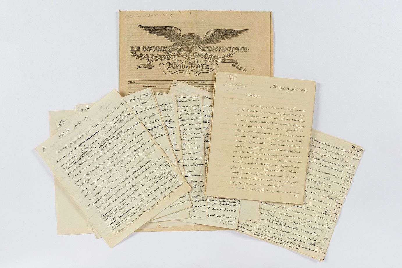 On joint une copie avec une nouvelle conclusion, et des corrections, feuillet intercalaire et couverture autographes | et une autre copie avec qqs corrections et des compliments autographes | plus le numéro du 31 janvier 1829 du journal new-yorkais avec qqs notes autographes.