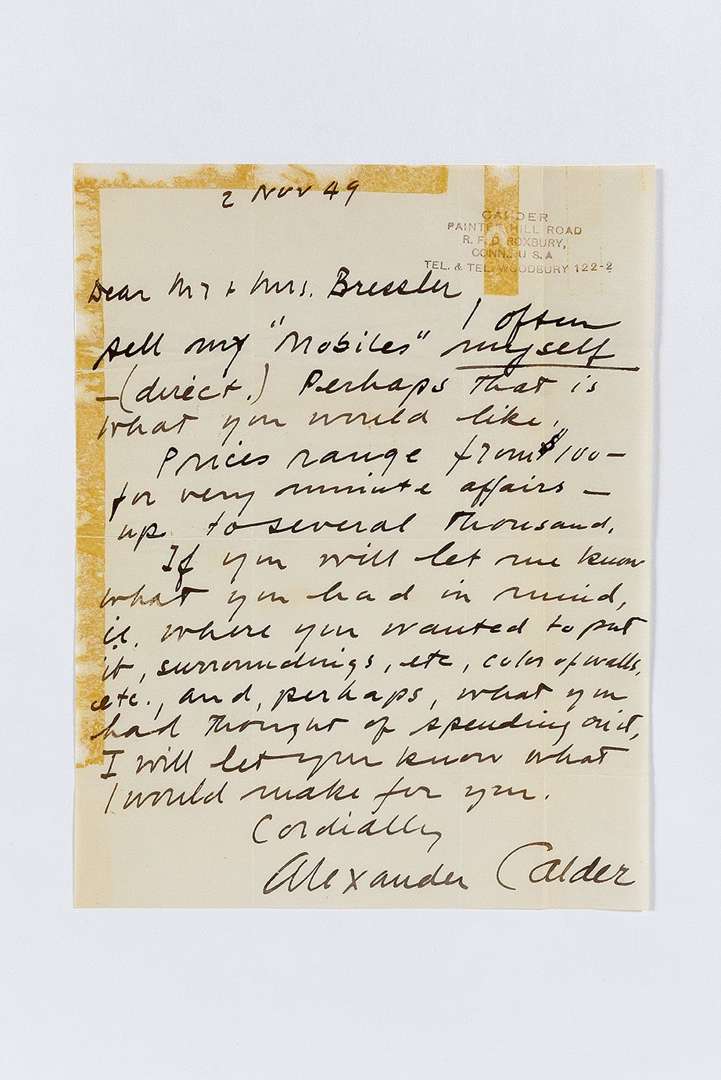 L.A.S. « Alexander Calder », Roxbury 2 novembre 1949, à Mr & Mrs. Bressler | 1 page in-4 à son cachet en-tête (traces d'adhésif) | en anglais.