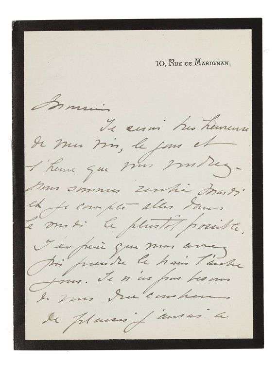 Au futur auteur de Mary Cassatt, un peintre des enfants et des mères (Ollendorff, 1913). 18 octobre [1911]. Elle le prie d'excuser son retard à lui répondre : « La vérité est que je suis en ce moment une pauvre femme malade, incapable de m'occuper de rien. Après un hiver passé en Egypt j'ai eu la grande douleur de perdre le dernier membre de ma famille à Paris au printemps dernier [son frère Gardner]. La chose a été trop pour moi et je ne commence que maintenant à sortir d'une dépression nerveuse qui m'a enlevé toute force »... Elle ne fait que passer à Paris pour voir un médecin, et remet à plus tard le plaisir de le voir. « Quant à ce que Monsieur Destrées vous a dit, il y a erreur je ne possède qu'un seul de mes tableaux, et je ne crois pas que ce soit parmi les meilleurs. Mess. DURAND-RUEL savent beaucoup mieux que moi où sont mes tableaux, ausssi chez M. VOLLARD 6 rue Lafitte il y a des pastels »... Elle le charge de répondre au souvenir de CLEMENCEAU. « J'espère qu'il garde toujours sa grande vitaliité et son bel énergie. Les hommes en Amérique s'en vont de si bon heur terrassé par la lutte à soixante ans. Combien on est plus sage ici »... Jeudi. Elle est rentrée mardi et aura plaisir à le voir, en début d'après-midi, « car je suis obligée de prendre l'air quand le temps est beau »...