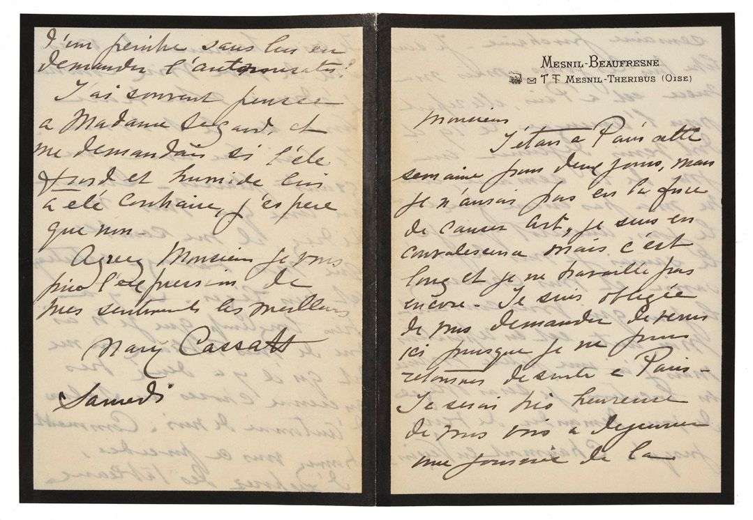 CASSATT Mary (1844-1926). L.A.S., Mesnil-Breaufresne par Mesnil-Theribus (Oise) Samedi [automne 1911], au critique d'art Achille SEGARD | 4 pages in-8 à son adresse (petit deuil).