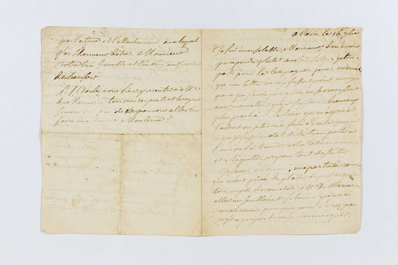 Il se dit inconsolable de n'avoir pu lui répondre plus tôt, mais une fièvre l'a forcé à prolonger son séjour à la campagne... Son ami connaissait les raisons qui l'ont « privé du plaisir de passer quelque tems auprès de vous et de Me de Marnesia », mais le silence lui faisait craindre d'avoir perdu sa si précieuse amitié : « Je suis charmé […] d'être rassuré par vous même et j'attribue tout à cette mauvaise goute dont vous parlez ». Il serait ravi « si je pouvois me dedomager cet hyver du tems perdu », mais il est retenu à Paris par sa santé et toutes sortes d'engagements, dont sa comédie Le Marchand de Smyrne « qui sera peut-être joué cet hyver, une autre bagatelle qui le sera à la cour au commencement de novembre, une tragédie qui doit être prête au printems prochain, voila plus de besogne qu'il n'en faut à une tête et à une santé comme la mienne. Ainsi Monsieur je suis obligé de remettre à un autre tems le projet d'aller partager votre solitude »… Il est enchanté de le voir songer à un Éloge de Fénelonn : « Ce sujet vous convient de toutes les manières et son âme est digne d'être louée par la votre. Des occupations d'un autre genre m'empêcheront d'être votre concurrent et mes vœux sont sans réserve pour l'amitié »…