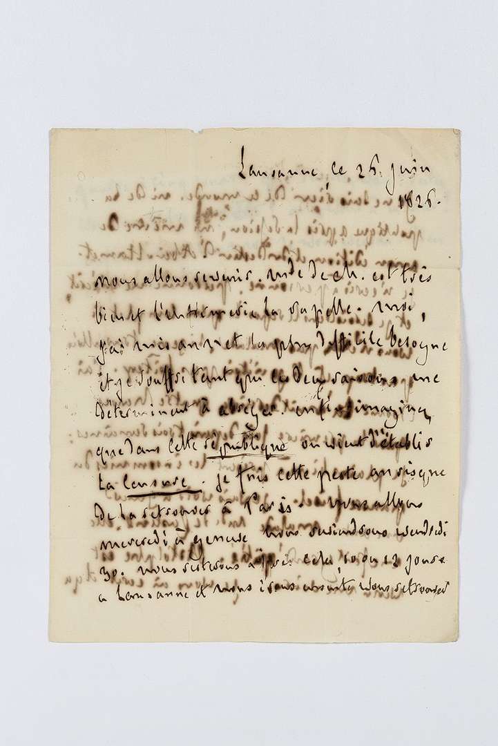 CHATEAUBRIAND François-René de (1768-1848). L.A., Lausanne 26 juin 1826, à son amie la duchesse de DURAS | 2 pages et quart in-4. Lettre évoquant la censure et la publication du Dernier Abencérage. Il annonce leur retour à Paris| Mme de Chateaubriand va bien et l'infirmerie la rappelle. « Moi, j'ai mis au net la plus difficile besogne et je souffre tant que ces deux raisons me déterminent à abréger. Enfin, imaginez que dans cette république on vient d'établir la censure. Je fuis cette peste au risque de la retrouver à Paris ». Il va faire un bref voyage à Genève, avant de revenir pour une douzaine de jours à Lausanne, et de rentrer à Paris. « Je ne sais rien de ce monde, ni de la politique après la session, ni même de mon édition et du destin d'Aben-Hamet. Je n'écris à personne, personne ne m'écrit, et je serois dans le repos le plus complet si vous n'étiez pas malade, si je ne travaillois pas trop et si je n'étois pas boîteux. J'ai dormi la nuit dernière quatre heures pour la première fois depuis trrrrois ssemaines : je plains bien à présent les insomnies du pauvre Frisel. Je vais voir à Genève une autre malade Mde de CUSTINE. Elle me fait grand'pitié. Astolphe est venu me voir. [...] Que devenez-vous ? Restez-vous dans votre forêt ? Allez-vous à la mer ? Enfin avant un mois je vous verrai. Dieu soit loué de tout ».