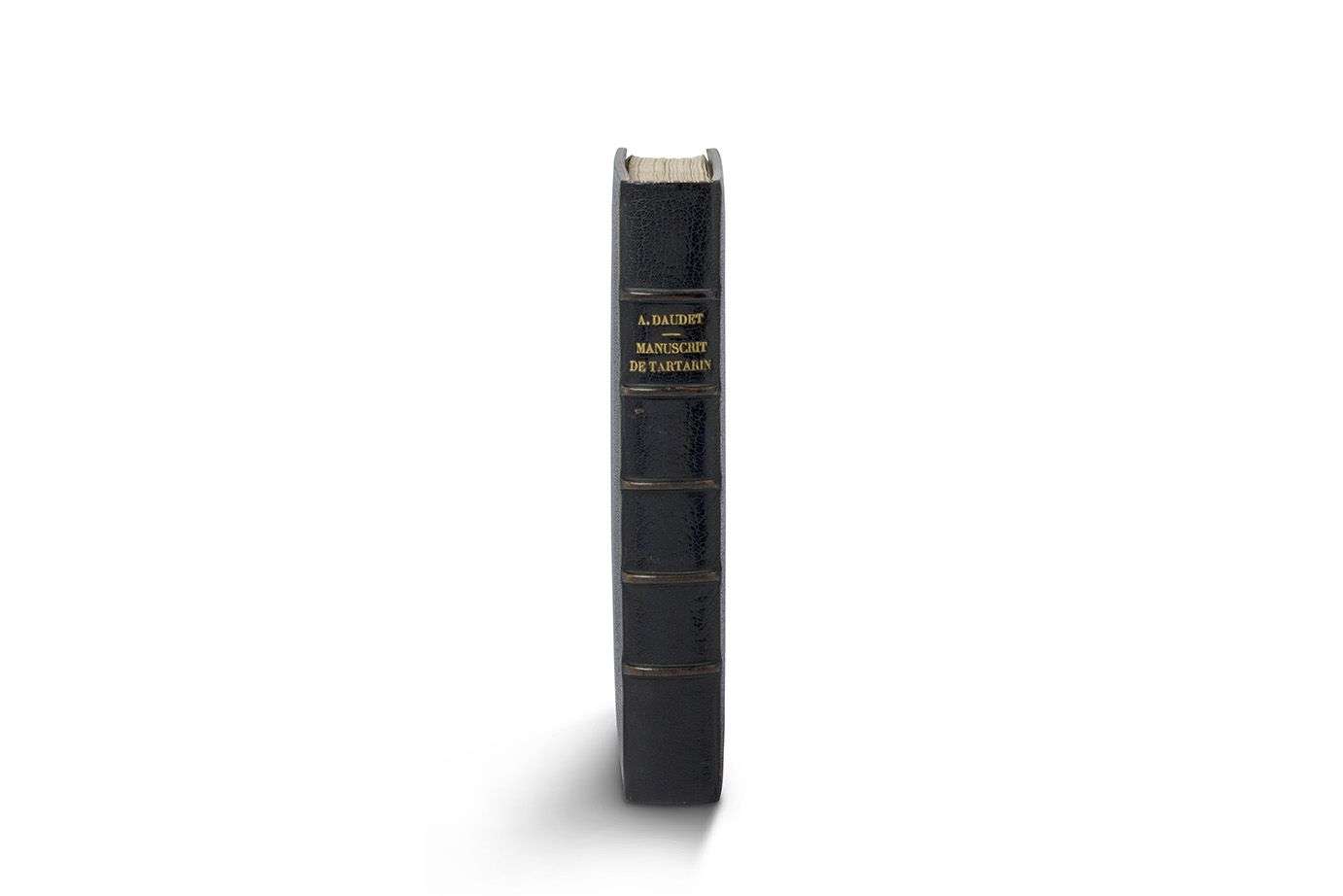 DAUDET Alphonse (1840-1897). MANUSCRIT en partie autographe, Bompard et Tartarin, aventures de deux alpinistes, [Tartarin sur les Alpes, 1884] | 239 feuillets petit in-4 (21,5 x 17 cm), foliotés 1 à 241 (83-84 et 93-94 sur un feuillet) | reliure maroquin bleu nuit, dos à nerfs, doublure de maroquin havane, encadrement de feuillages mosaïqués de maroquin vert et rouge, gardes de faille havane, doubles gardes de papier jaspé, étui. Manuscrit complet du roman Tartarin sur les Alpes. Suite des aventures de Tartarin de Tarascon, le roman raconte le nouvel exploit du chasseur de fauves, parti à l'assaut des sommets alpins, la Jungfrau et le Mont Blanc… Le manuscrit porte le titre primitif : Bompard et Tartarin, aventures de deux alpinistes. Seul le premier chapitre est autographe (16 feuillets) est autographe. Le reste du manuscrit est de la main de son secrétaire Jules Ebner, à qui Daudet dictait, et porte de nombreuses corrections autographes de Daudet. Le manuscrit est rédigé à l'encre brune au recto deees feuuillets | il présente de nombreuses ratures et corrections | il a servi pour l'impression de l'édition originale, publiée sous le titre Tartarin sur les Alpes. Nouveaux exploits du héros tarasconnais (Calmann-Lévy, « Collection Guillaume », 1885), et porte des indications du typographe au crayon bleu. Il est divisé en 14 chapitres, le dernier, XIV, intitulé Épilogue. On a relié en tête : - un portrait de Daudet gravé par Adrien Nargeot | - 2 L.A.S. d'Alphonse Daudet à l'éditeur Édouard Guillaume : Champrosay 25 juillet 1884 (1 p.in-8) : « Décidément votre offre me séduit et je suis prêt à m'engager avec vous et vos associés pour un roman inédit à illustrer. Comme vous avez plus la pratique des affaires que moi, veuillez faire un traité que nous lirons et débattrons ensemble. Mes conditions sont celles-ci : une prime de 25.000 francs me sera payée quand je livrerai la première moitié de mon manuscrit. Je toucherai 3 fr. 50 par exemplaire sur le volume à 20 francs [...] Titre provisoire : Bompard et Tartarin, ou le Voyage en Suisse »… 10 mars 1885 (1 p. in-12) : « Tartarin est à Interlaken, il veut aller à Montreux. Quel chemin de fer prend-il, par où passe-t-il pour arriver vite ? » - Un reçu autographe signé de Daudet, Paris 30 décembre 1885 : « Reçu de MM.Guillaume la somme de vingt mille francs »… Provenance : Alain de Suzannet (ex-libris armorié | vente 1936, n° 44) | Pierre Guérin (ex libris) | Du Bourg de Bozas Chaix d'Est Ange (ex-libris armorié, vente 27-28 juin 1990, n° 170).