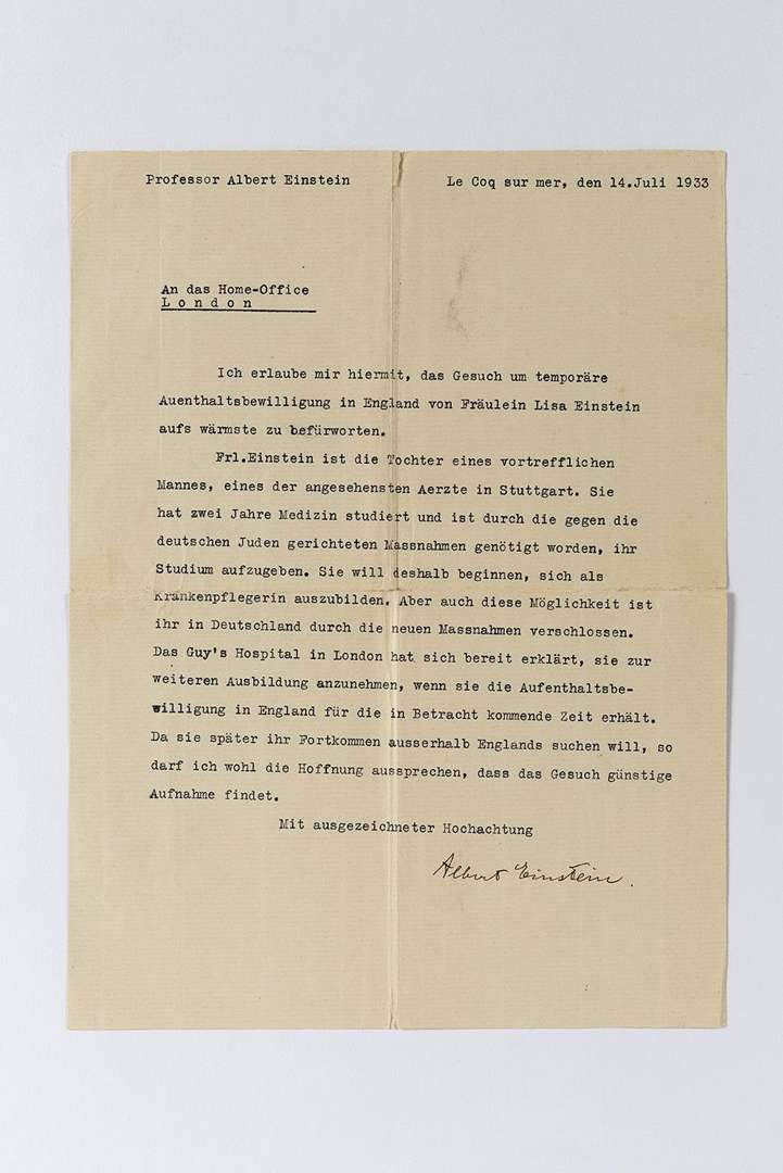 EINSTEIN Albert (1879-1955). L.S. « Albert Einstein », Le Coq que mer 14 juillet 1933, à Édouard GUILLAUME | 1 page in-4 dactylographiée (traduction anglaise jointe). Il soutient chaudement l'initiative de Lisa Einstein pour obtenit la permission d'un éjour en Angleterre. Lisa Einstein est la fille d'un des meilleurs docteurs de Stuttgart. Elle a étudié la médecine pendant deux ans mais est forcée, à cause des mesures contre les juifs allemands (« durh die gegen die deutschen Juden gerichteten Massnahmen ») d'abandonner ses études. Elle souhaite devenir infirmière, carrière qui lui est également interdite en Allemagne à la suite des nouveaux réglements. Le Guys Hospital de Londres serait prêt à l'accueillir…