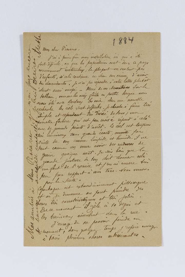 GAUGUIN Paul (1848-1903). L.A.S. « P. Gauguin », [Copenhague fin novembre-début décembre 1884], à Camille PISSARRO | 4 pages in-8. Belle et longue lettre de Gauguin sur son arrivée au Danemark et ses nouvelles peintures. Il a à peine fini son « qui a été fort difficile, vu que les propriétaires sont dans ce pays excessivement méticuleux | la plupart ne veulent pas d'enfants, si cela continue ce sera un crime d'avoir des descendants »... Il remercie Pissarro de ses observations sur son tableau... « Dans ma nouvelle recherche les ciels sont difficiles. Je cherche à faire très simple et cependant très divisé de tons : ma nouvelle facture qui est peu croisée répond à cela avec de grands points d'arrêt. Le ciel est toujours très lumineux sans grands écarts | par suite de son essence limpide et humide il ne peut comme un mur avoir des rudesses de grain quoique mat. Je sais bien que la grande justesse de ton doit donner cela. Il me faut de l'exercice et j'en ai encore très peu par rapport à vous tous. Nous vvvvverrrons par la suite. Copenhague est extraordinairement pittoresque et où je demeure on peut peindre des choses très caractéristiques et très jolies. En ce moment il gèle à 10 degrés et les traîneaux circulent dans la rue. J'enrage de ne pouvoir peindre en ce moment, dans quelque temps j'espère envoyer à Paris plusieurs choses intéressantes. En Danemarck c'est très facile ou très difficile d'être un peintre fort. Très facile parce que ce que l'on voit est tellement mauvais, de si mauvais goût, que la moindre chose d'art doit éclater au milieu de cela. D'un autre côté c'est très difficile parce que ce courant mauvais est tellement dans le caractère national que c'est presque une impolitesse de faire autrement ». Il décrit à son ami l'intérieur d'un salon danois, avec « des meubles en noyer verni toujours neufs », des bustes de poètes « avec des fleurs et des rubans autour », des photographies partout, et « quelques paysages à l'huile comme des chromo ». Il attend les eaux-fortes de Pissarro. sa femme a trouvé des leçons de français… « les Danois sont gens méticuleux aigre doux mesquins et d'un schoking extravagant. Un enfant de 2 ans ne pisse pas dans la rue, cela choquerait les mœurs. Un ménage illégal est défendu par la loi et peut être puni. Par contre les fiancés peuvent se promener n'importe où deux à deux. Que dites-vous de cela »… Puis il parle longuement de ses talents de graphologue, qui lui permettent de découvrir le caractère des gens d'après leur écriture : « Je ne suis pas encore très savant mais je suis sûr de découvrir un jour non seulement le caractère mais le sentiment qui a guidé une lettre. […] la pensée influe directement sur l'écriture ». Il demande si Pissarro a reçu une lettre de CÉZANNE. Mette, la femme de Gauguin, ajoute quelques mots pour Mme Pissarro. Correspondance (éd. V. Merlhès), t. I, p. 76-77 (n° 57). Provenance : Archives Camille PISSARRO (vente 21 novembre 1975, n° 59).