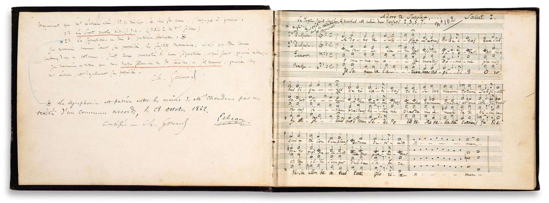 GOUNOD Charles (1818-1893). MANUSCRIT MUSICAL autographe signé, [37 cantiques et motets, vers 1843-1846] | carnet oblong petit in-4 de [1-33] feuillets la plupart recto-verso, plus des ff. vierges, reliure de l'époque basane noire, cadre de filets dorés et à froid sur les plats, titre au dos Saluts. Important recueil de 37 chœurs religieux, motets et cantiques en latin, du jeune compositeur au début de sa carrière, alors qu'il songe à entrer dans les ordres. Ces compositions sont notées avec soin dans un carnet de papier musique à 16 lignes, à l'encre brune ou parfois bleue, probablement directement, comme en témoignent plusieurs pages où une esquisse au crayon a été ensuite repassée à l'encre. Gounod a utilisé ce carnet alors qu'il était maître de chapelle à l'église des Missions étrangères, où il prit ses fonctions le 1er novembre 1843.