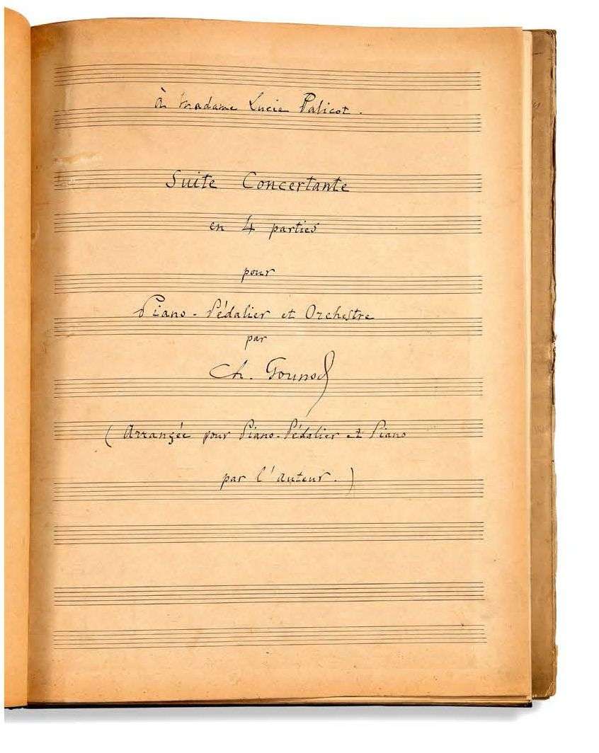 GOUNOD Charles (1818-1893). MANUSCRIT MUSICAL autographe signé « Ch. Gounod », Suite concertante en 4 parties pour piano-pédalier et orchestre, arrangement pour piano-pédalier et piano (1886) | 1 feuillet de titre et 32 pages in-fol., relié en un volume demi-basane grenat. Manuscrit de la transcription par Gounod de sa Suite concertante pour piano-pédalier et piano. Le 14 janvier 1886, Gounod cédait à Alphonse Leduc, pour 7.000 francs, la propriété d'une Suite concertante avec piano-pédalier, dont il devait donner le manuscrit le 7 avril, puis une réduction pour piano de la partie d'orchestre et une transcription pour deux pianos (qui sera finalement réalisée par Saint-Saëns).