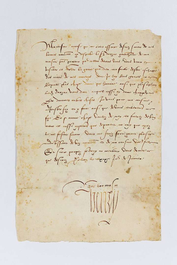 L.S. avec compliment autographe « Vre bon cousin Henry », Lyon 19 janvier [1526 ?], à Mme d'ESTOUTEVILLE | 1 page in-fol., adresse (quelques réparations au dos).