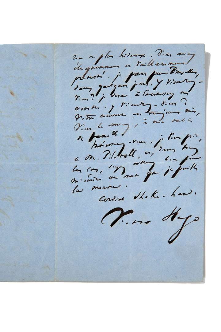 L.A.S. « Victor Hugo », H.H. [Hauteville House] 25 juin [1865 ?], à Eugène RASCOL | 2 pages in-8 sur papier bleu. Contre la peine de mort. [Eugène RASCOL dirigeait le Courrier de l’Europe, hebdomadaire publié à Londres.]