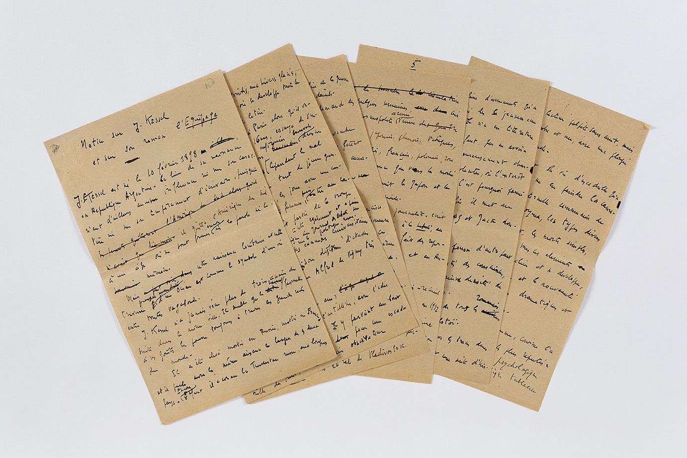 Cette notice, rédigée à la troisième personne, après la publication de L'Équipage (Éditions de la Nouvelle Revue française, 1923), présente de nombreuses ratures et corrections. Kessel y trace en quelques pages son enfance et sa jeunesse, insistant sur son caractère nomade.