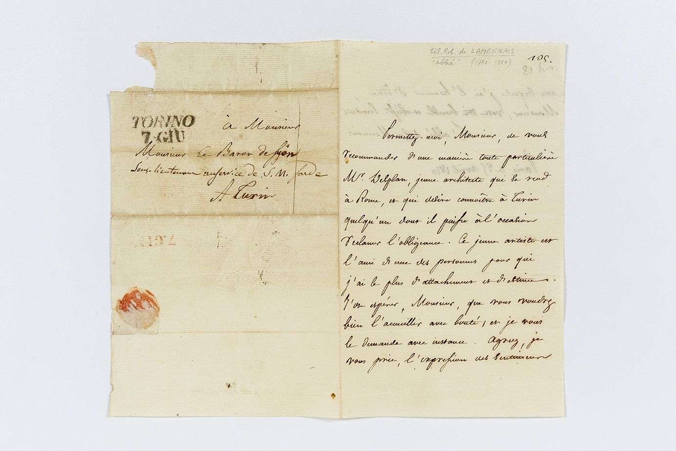 Il lui recommande M. DELPLAN, « jeune architecte qui se rend à Rome [] Ce jeune artiste est l'ami d'une des personnes pour qui j'ai le plus d'attachement et d'estime »