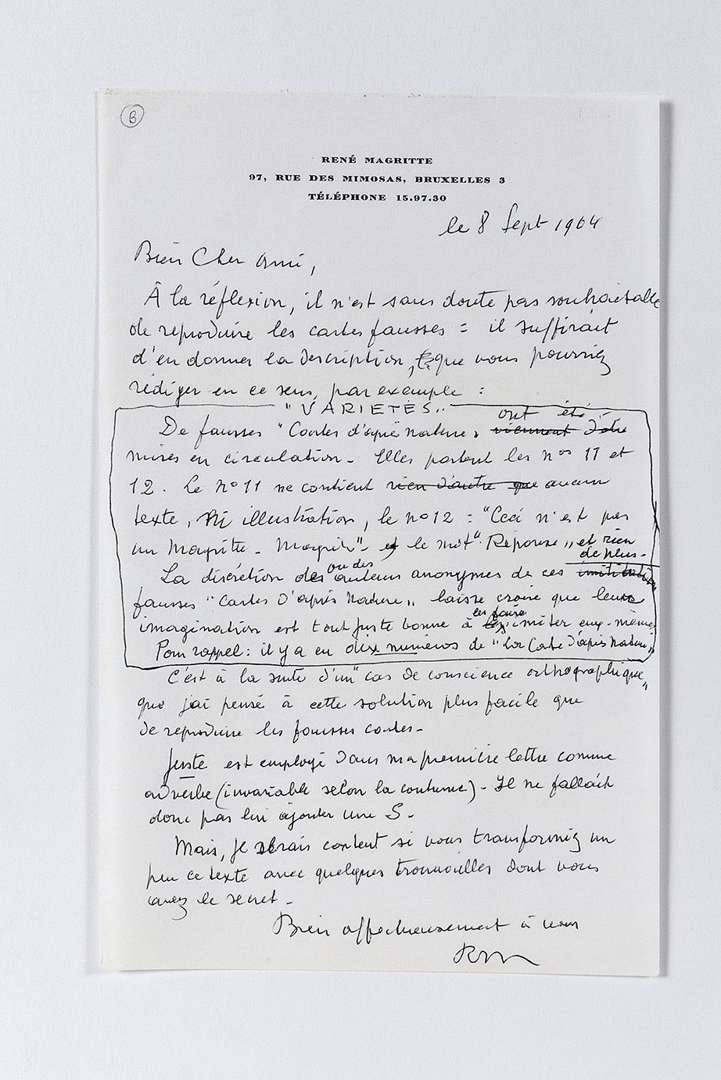 Il ne croit pas souhaitable de reproduire les cartes dans la revue Rhétorique. Il suffirait d'en donner la description suivante sous le chapeau Variétés : « De fausses “Cartes d'après Nature” ont été mises en circulation. Elles portent les nos 11 et 12. Le n° 11 ne contient aucun texte, ni illustration. Le n° 12 : ”Ceci n'est pas un Magritte-Magritte” et le mot “Réponse” et rien de plus. La discrétion du ou des auteurs anonymes de ces fausses “cartes d'après nature” est tout juste bonne à les faire s'imiter eux-mêmes »...