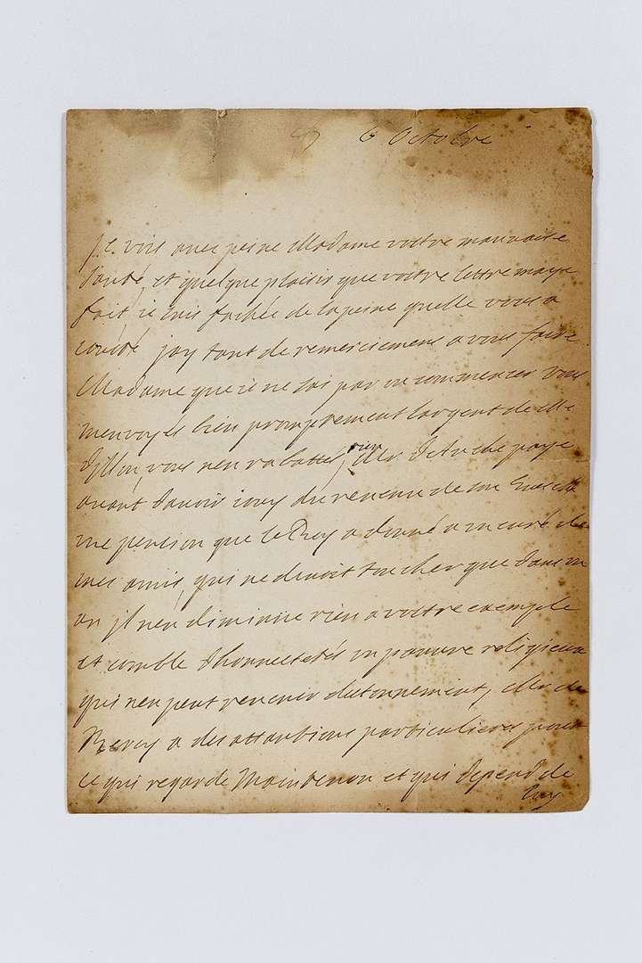 L.A.S. « Maintenon », 6 octobre, à Mme du MARETZ à Paris | 1 page et demie in-4, adresse avec fragments de cachet cire aux armes (brunissures aux bords).