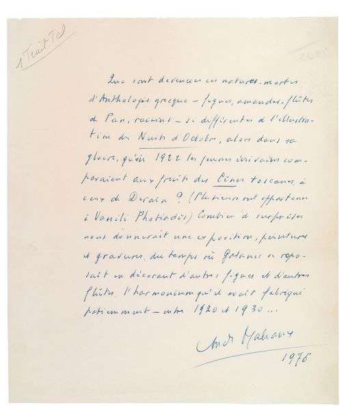 Que sont devenus ces natures mortes d'Anthologie grecque - figures, amandes, flûtes de Pan, raisains - si différentes de l'illustration des Nuits d'Octobre, alors dans sa gloire, qu'en 1922 les jeunes écrivains comparaient aux fruits des cènes toscanes à ceux de Derain ? (...) Combien de surprises nous donnerait une exposition, peintures, et gravures, du temps où Golanis se reposait en décorant d'autres figures et d'autres flûtes (...)