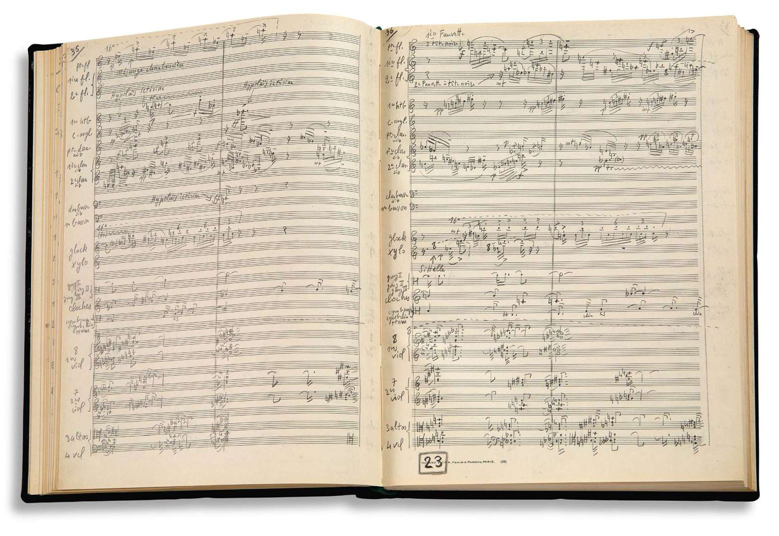 MANUSCRIT MUSICAL autographe signé « Olivier Messiaen », Chronochromie pour orchestre (1960). | un fort volume in-fol. de 4 feuillets et 215 pages (plus 6 titres intermédiaires), interfoliés de serpentes, reliure de toile noire.