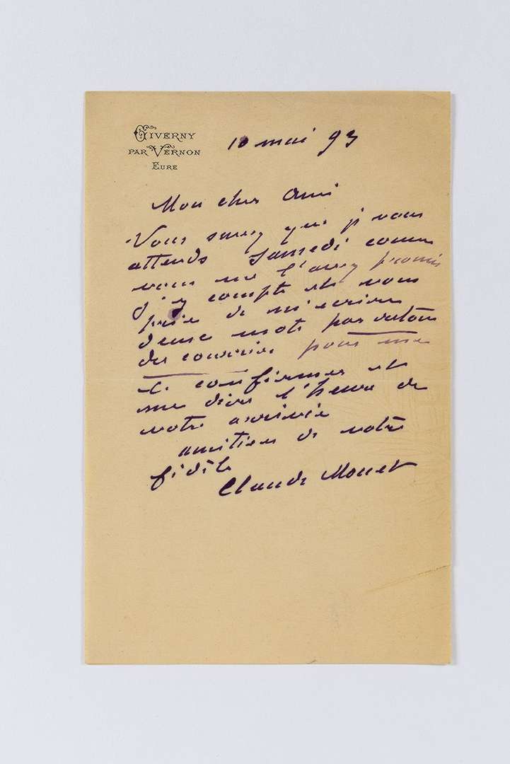 L.A.S. « Claude Monet », Giverny 10 mai 1893, à Gustave GEFFROY | ¾ page in-8 à en-tête Giverny par Vernon, enveloppe.