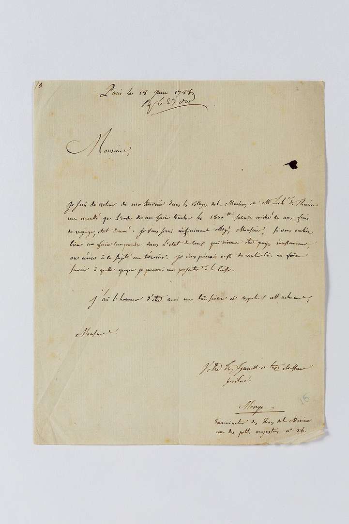 Il est de retour de sa « tournée dans les Colleges de la Marine », et aimerait être payé rapidement des 1800 livres « seconde moitié de mes frais de voyage ».