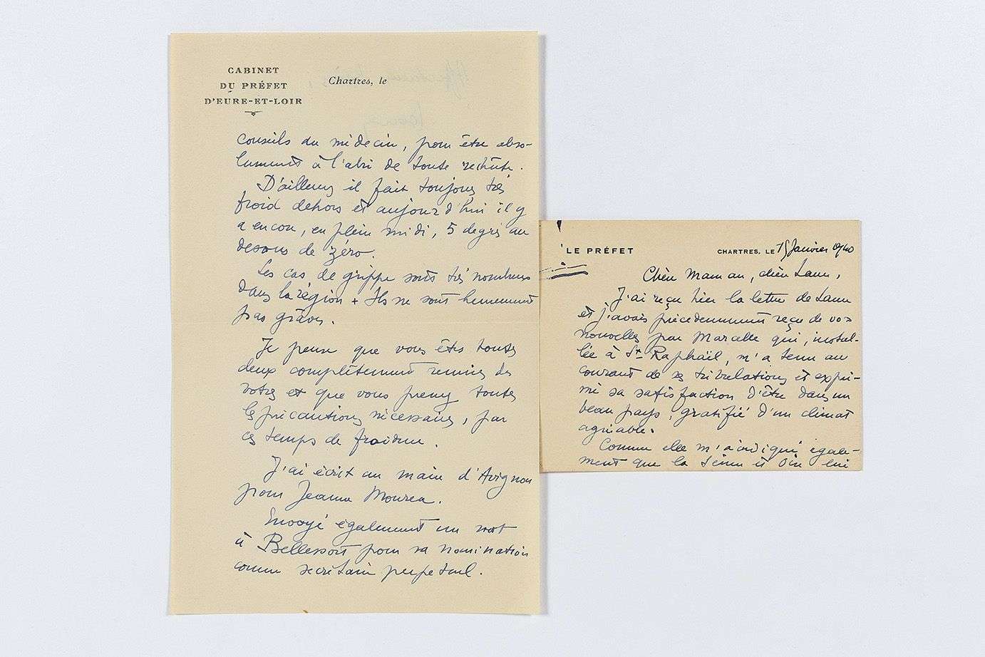 L.A.S. « Jean », Chartres 15 janvier 1940, à sa mère Mme Antoine-Émilie MOULIN et sa sœur Laure MOULIN, à Montpellier | 2 pages oblong in-12 à en-tête Le Préfet, et 1 page et quart in-8 à en-tête Le Cabinet du Préfet d'Eure-et-Loir, enveloppe.