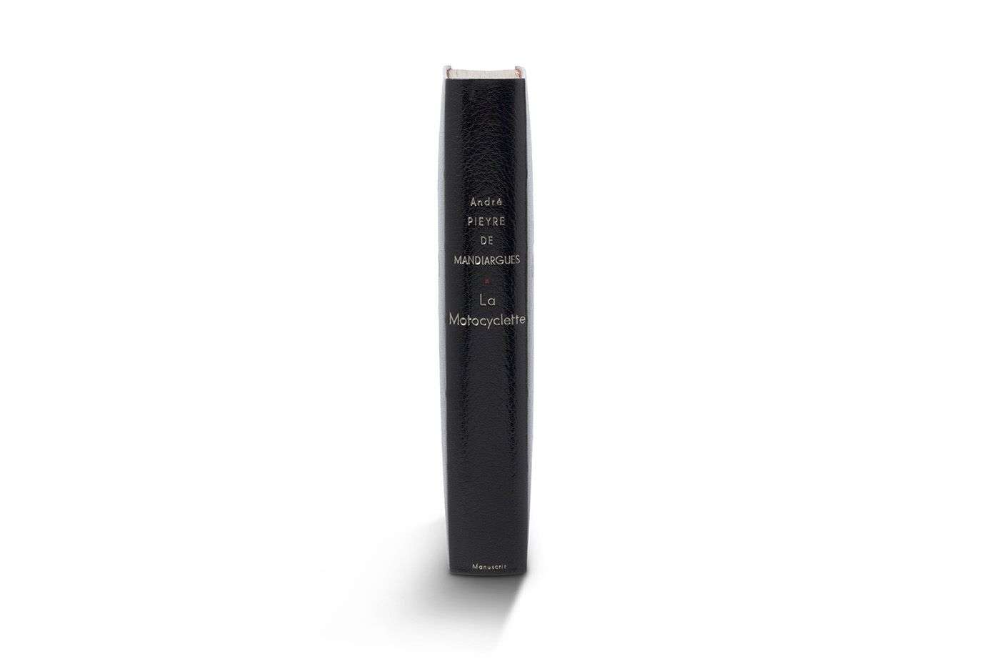MANUSCRIT autographe, La Motocyclette, 1960-1962 | 134 pages in-4 montées sur onglets | reliure de maroquin noir, les plats ornés d'un décor abstrait mosaïqué en veau glacé noir, blanc et rouge et de pièces de veau argentée à la feuille | doublures, bords à bords, et gardes de veau rouge | doubles gardes de papier à la main : tranches argentées sur témoin | chemise et étui (M. de Bellefroid).