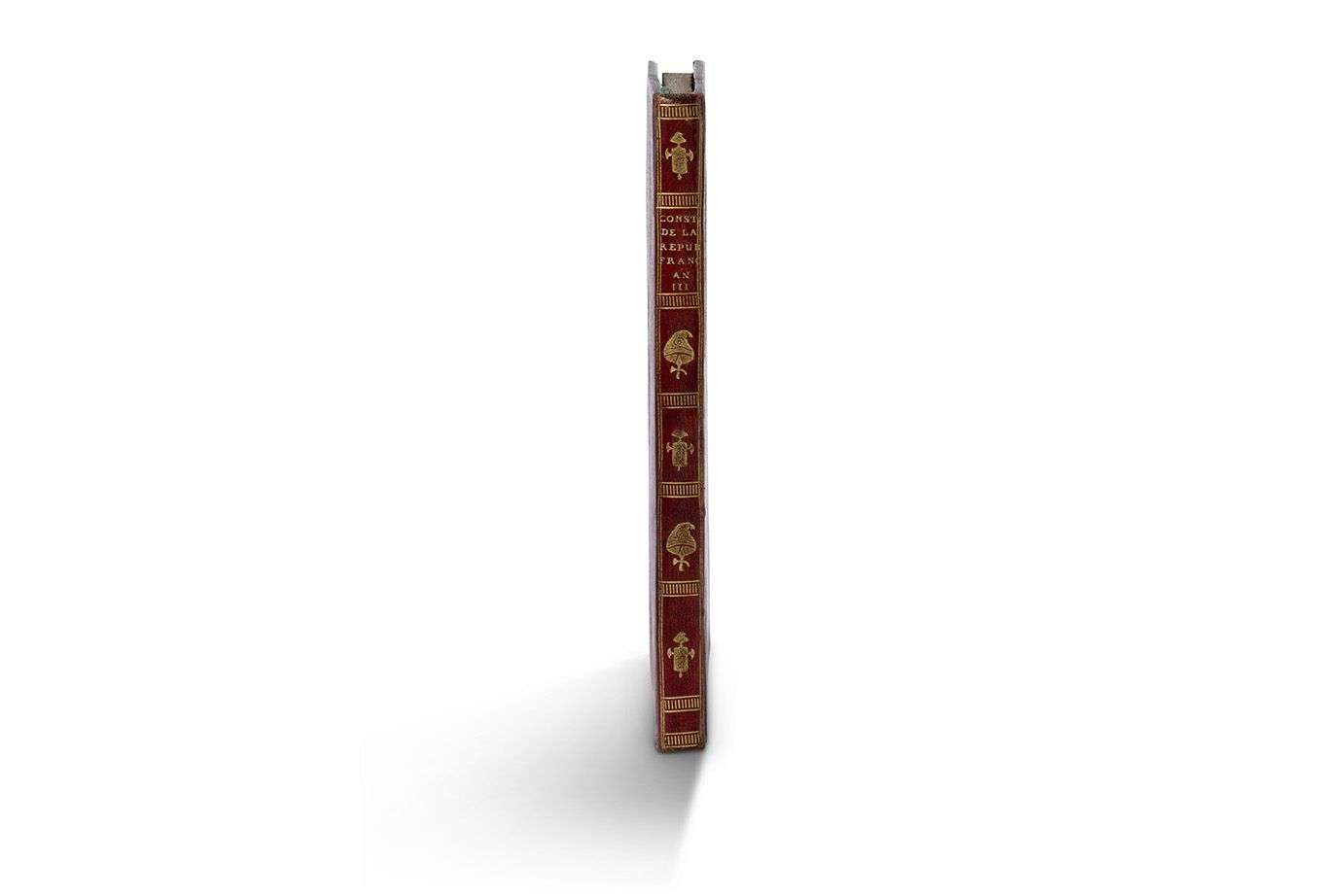 Constitution de la République Française (Paris, Imprimerie du Dépôt des lois, [1795]) | in-4 de 43 pages, suivies de ff. blancs | reliure de l'époque en maroquin rouge, cadre de filets dorés avec le faisceau de licteur surmonté du bonnet phrygien et la devise Union Force et Liberté sur les plats, et le titre en lettres dorées sur le plat sup., dos orné de faisceaux et de bonnets phrygiens.