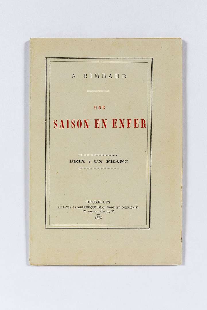 Édition originale du seul ouvrage dont Rimbaud ait entrepris la publication, à compte d'auteur. Une saison en enfer fut tirée à 500 exemplaires environ, il n'y a pas eu de grand papier. Sur ces quelque 500 exemplaires, 425 restèrent chez l'éditeur Poot, et ne furent pas diffusés, Rimbaud n'ayant pu les récupérer, faute d'argent. Il ne put disposer que d'une dizaine d'exemplaires. Le reste du tirage demeura dans la cave de l'Alliance typographique jusqu'à sa redécouverte en 1901 par Léon Losseau. À partir de 1911, le bibliophile belge dispersa peu à peu l'ouvrage sur le marché.