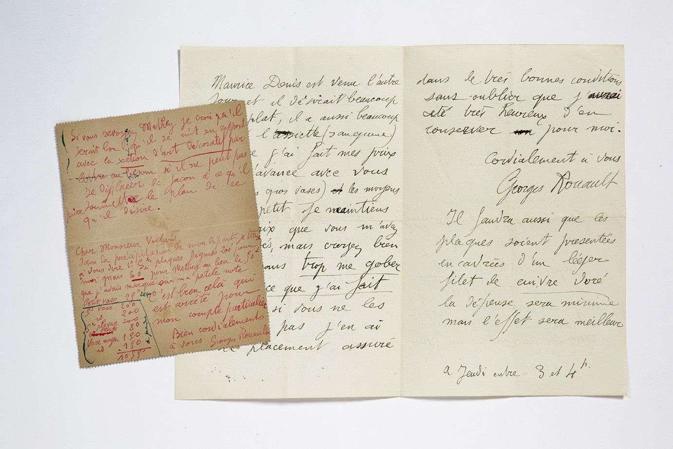 2 L.A.S. « Georges Rouault », [juin 1907], à Ambroise VOLLARD | 4 pages in-8, et 1 page in-12 à l'encre rouge avec adresse au verso (carte-lettre).