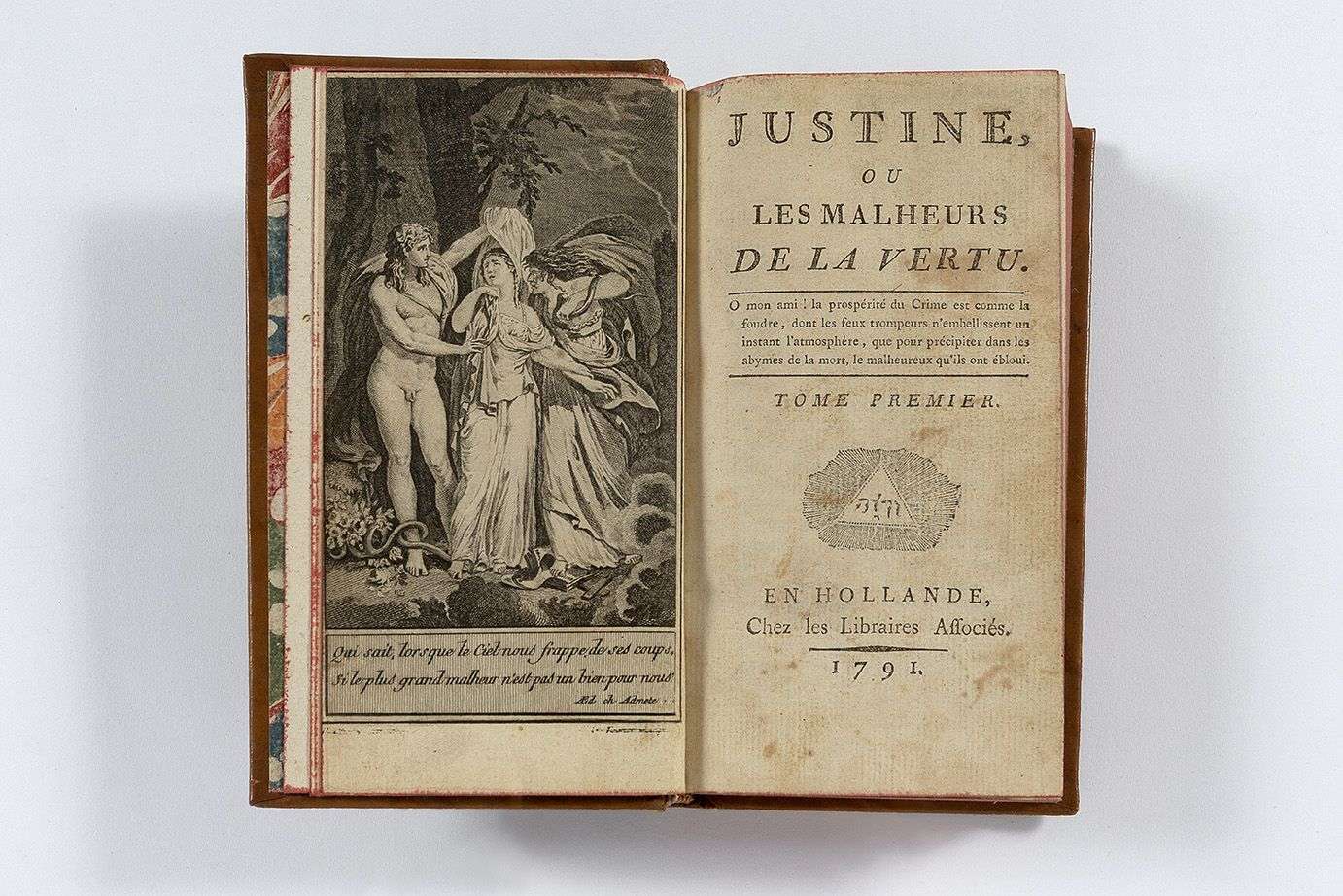 Justine ou les malheurs de la vertu. En Hollande [Paris], Chez les Libraires associés [Girouard], 1791. 2 tomes réunis en un volume au format in-12. (4)-339 pp. et (3)-228 pp. Complet des faux-titre et titres pour chaque partie, frontispice gravé en noir au tome I. Vignette maçonnique de bois gravé au titre. Basane fauve finement mouchetée moderne, habilement réalisée dans le style de l’époque, dos lisse orné de compartiments de filets dorés, pièce de titre de maroquin rouge, titre doré, frise dorée sur les coupes, tranches rouges, doublures et gardes de papier marbré de type coquille. Premier livre imprimé du Marquis de Sade, roman clé de la philosophie sadienne. Publié anonymement un an après sa libération de la Bastille consécutive à l'abolition des lettres de cachet par la Révolution, à partir de son conte manuscrit rédigé en prison, les Infortunes de la Vertu. Complet des rarissimes Avis de l’Editeur et Explication de l’estampe, après le titre. De la même année que l’originale et présenté parfois comme le princeps lui-même. Ce tirage est la première réimpression parue quasi concomitamment du princeps. Les variations subtiles et parfois mal connues peuvent rendre les confusions possibles. Girouard fut le tout premier éditeur du marquis, commençant les tirages d’Aline et Valcour aux côtés du Justine, il sera exécuté par le Tribunal révolutionnaire. Frontispice allégorique signé (biffé) gravé par G. Texier pour ce tirage, d’après le peintre néo-classique et révolutionnaire Philippe Chéry (comme pour l’autre frontispice de 1791). Il représente la Vertu prise entre la Luxure et l’Irréligion et est réalisé en miroir de l’autre frontispice, les figures sont donc inversées. Dédié à sa « Bonne amie » sur un texte de 3 pp., en réalité sa maîtresse, Marie-Constance Quesnet. Un seul exemplaire au CCFr (BnF). Notre ouvrage possède avant toute chose le caractère propre aux originaux de Sade : leur extrême rareté. Dispersés ou détruits par la censure, publiés anonymement ou « sous le manteau », malgré leur succès éditorial d’alors, on ne trouve que très rarement les exemplaires de l’époque, à plus forte raison complets ou intègres. « Justine scandalise, certes, mais surtout elle effraie. Sa publication provoqua la panique… » (Maurice Lever). Comme la plupart des romans de Sade, Justine est un texte d’une grande violence, laquelle se manifeste sous la forme d’une force “fondamentalement brute” ; son succès et ses évolutions érotico-philosophiques conduisant en 1801 à l’arrestation sans jugement de Sade et son internement à vie à Charenton. Pia, L’Enfer, 388. Gay-Lemonnyer, II, 752. Une page (f.4, le début de l’avis de l’éditeur) restaurée, peut-être suite à un morceau gratté ou arraché avec reconstitution amateur mais assez discrète du texte sur une bande d’environ 1 x 5 cm. Qques brunissures et tâches du temps mais exemplaire resté assez frais. PHILOSOPHIE DES LUMIÈRES. ROMAN EROTICO-LIBERTIN.